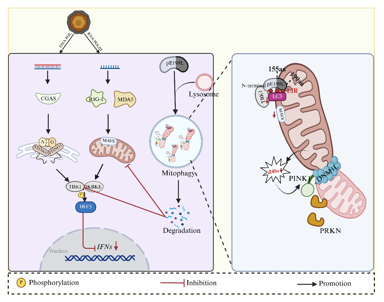 非洲猪瘟是一种急性、高度致死性的动物传染病,目前已在全球多个国家蔓延,给养猪业造成巨大经济损失,由于病毒基因组庞大、结构复杂且缺乏安全有效的疫苗,导致防控工作面临严峻挑战。因此,揭示ASFV复杂的致病机制是研发疫苗和抗病毒策略的关键。该研究团队经过系统攻关发现ASFV编码的pE199L蛋白通过其C端疏水结构域(155-199 aa)精准定位至线粒体,一方面通过促进DNM1L/Drp1蛋白的磷酸化,诱导线粒体过度分裂,促进线粒体自噬;另一方面利用三个保守的LC3结合基序(LIR)直接结合LC3蛋白,进一步诱导线粒体自噬。更为关键的是,研究首次发现pE199L蛋白具备“双重免疫压制”能力,可同时降解TBK1(cGAS-STING通路)和MAVS(RLR-MAVS通路)两种关键抗病毒信号蛋白,显著抑制I型干扰素产生,为病毒复制创造有利条件。